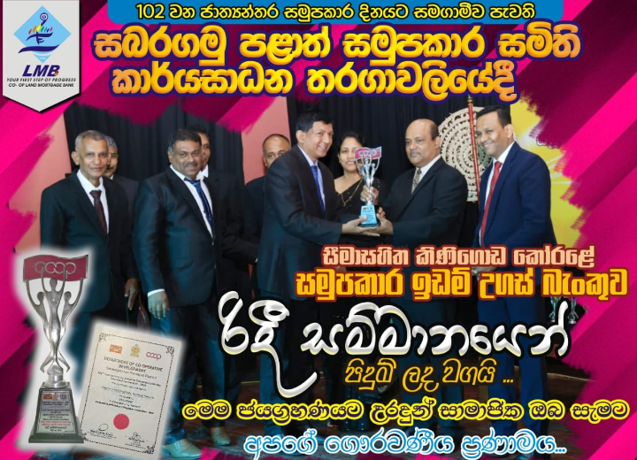 102 වන ජාත්යන්තර සමුපකාර දිනයට සමගාමීව පැවති සබරගමු පළාත් සමුපකාර සමිති කාර්යසාධන තරගාවලියේදී සීමාසහිත කිණිගොඩ කෝරළේ සමුපකාර ඉඩම් උගස් බැංකුව වන අප රිදී සම්මානයෙන් පිදුම් ලද වග මහත් අභිමානයෙන් යුතුව දන්වා සිටිමු.